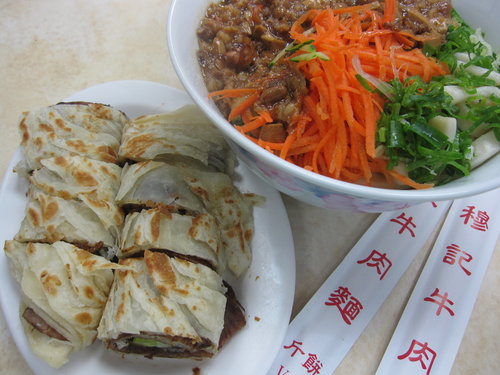 結束再繞去吳興街吃個最好吃的「穆紀牛肉麵」,牛肉捲大餅和酢醬麵~