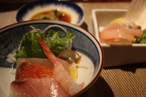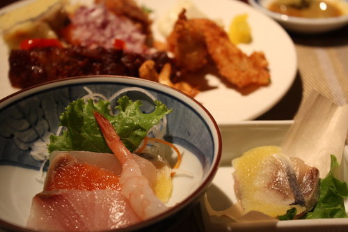 等我入席,勉力吃點肉跟生魚片,一級的飲食,是跑不掉的~