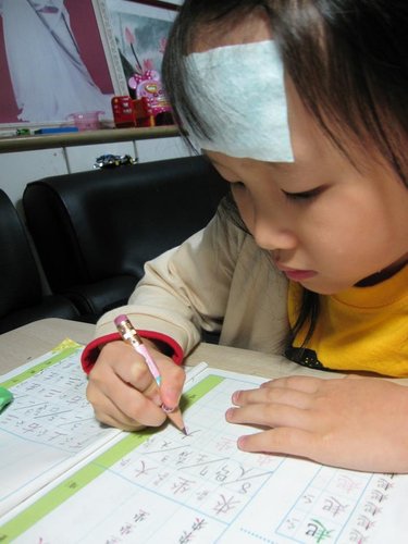 生病中趕作業的我女Mina,頭上還貼著退熱貼哩~